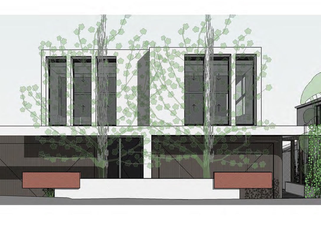 Custom-designed townhouse with lowered roof garages to comply with local regulations.